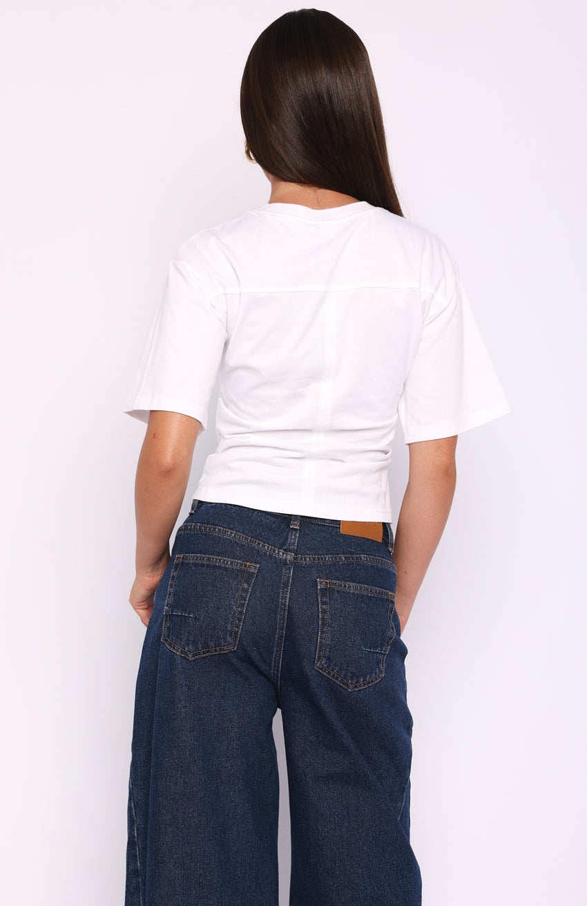 Wear it on repeat. The Destination Unknown Boxy Tee White is your new wardrobe staple! Featuring a high cut, ribbed neckline, unlined material, side pleated detailing and back panel design for a cinched look and drop shoulder design. Complete the look with a mini skirt and layered gold accessories for a fit we adore!